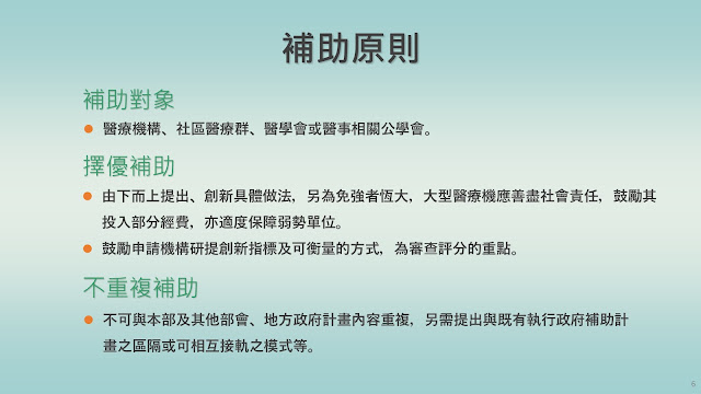 為促進與其鼓勵各醫療機構、專業醫學(公)會等,提出開創性與落實分級醫療與垂直整合,為我國醫事人力人才培育留任、醫療環境再造等之多元規劃,「健康台灣深耕計畫」期程為 5 年,總經費為 489 億元,採由下而上提出具體多元、創新之作法,申請者需以長期深耕的視角提出規劃,並依據
